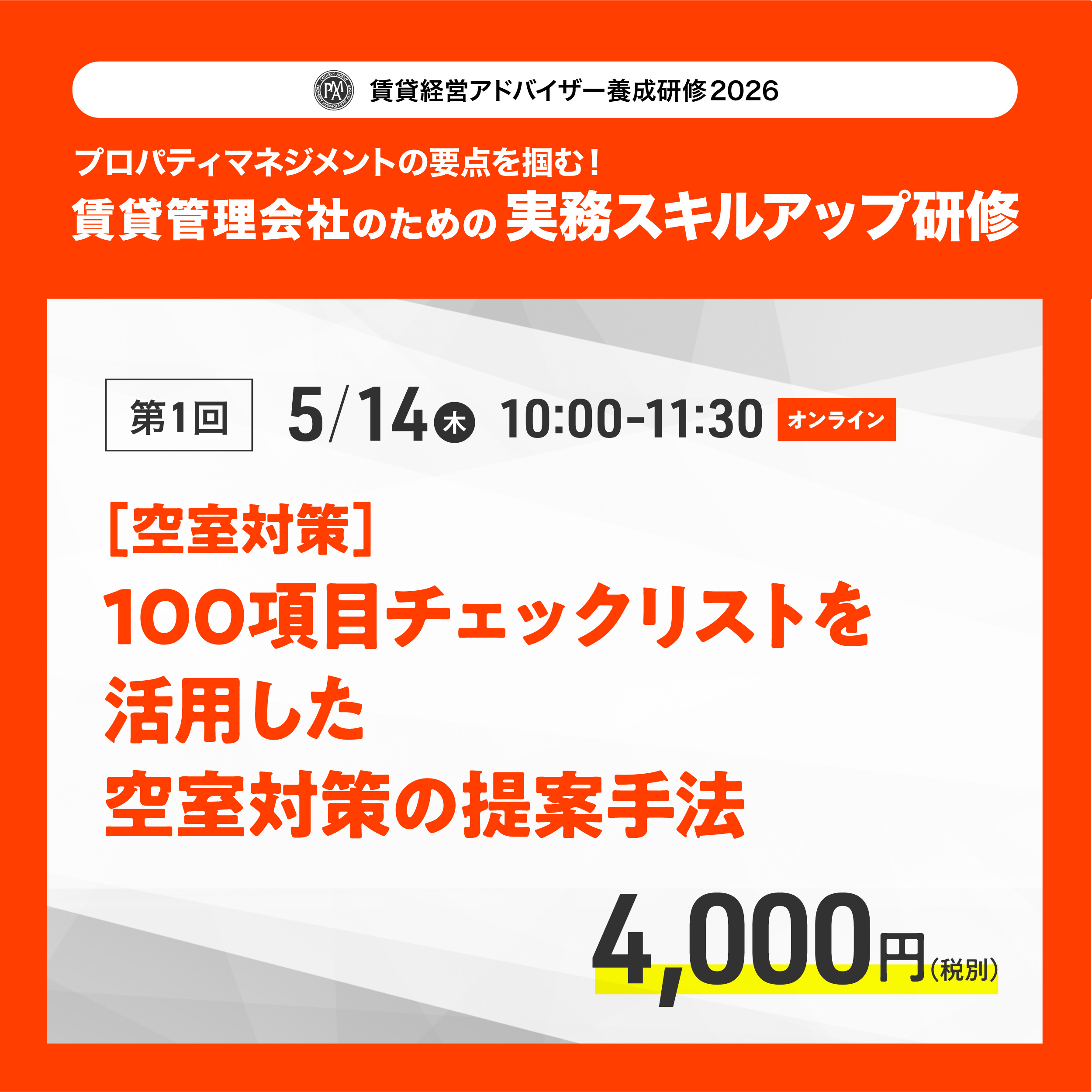 第1回:【空室対策】100項目チェックリストを活用した空室対策の提案手法 2026年5月14日(木) 10:00~11:30 WEB研修