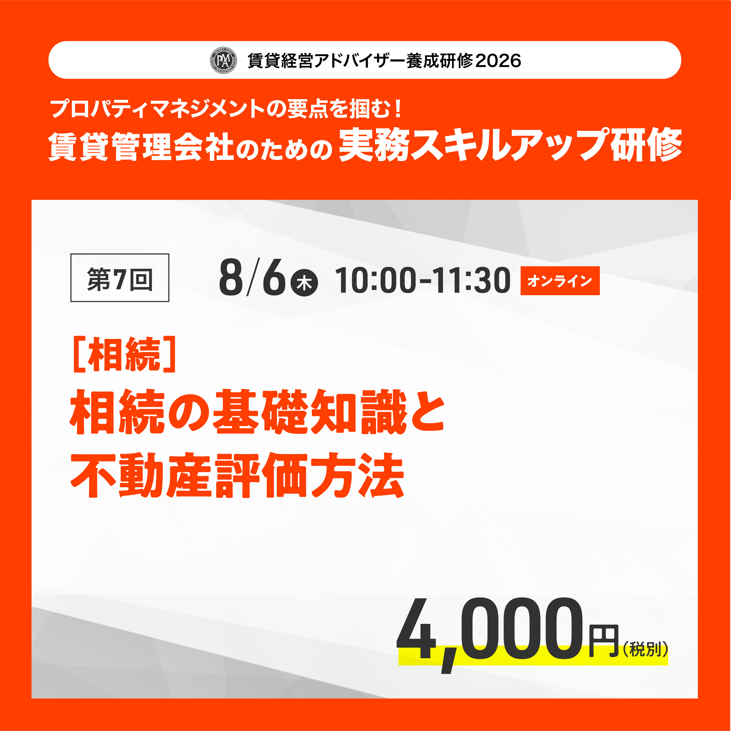 第7回:【相続】世代を超えたお付き合い。相続の基礎知識と不動産評価方法 2026年8月06日(木) 10:00~11:30 WEB研修